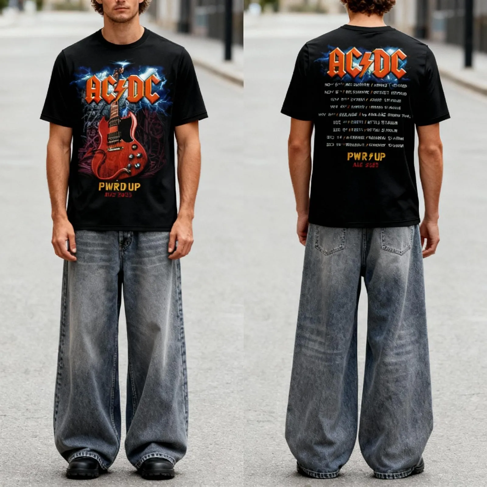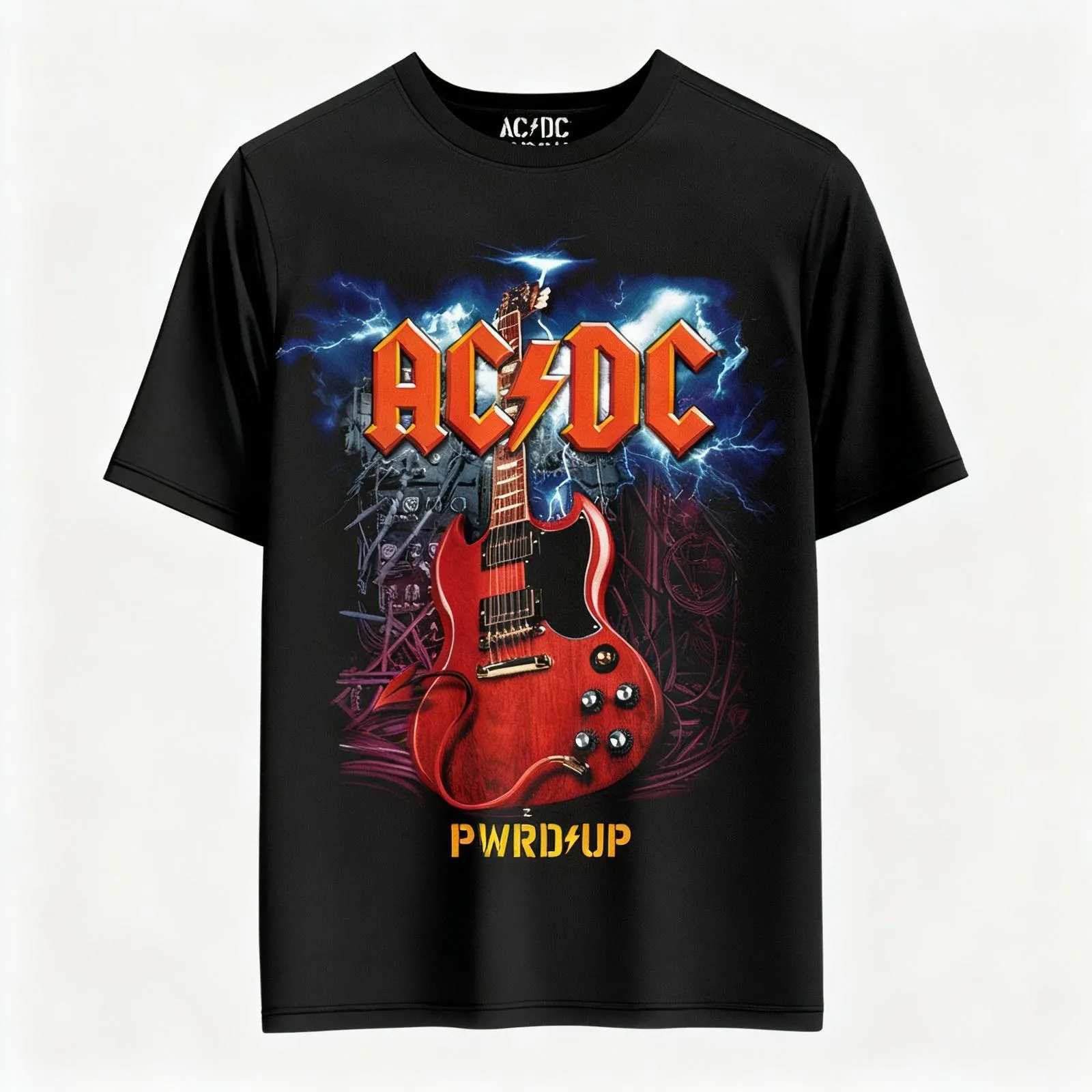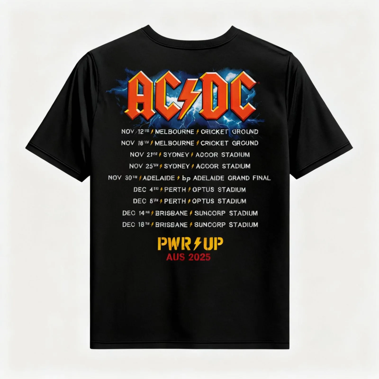 Gear up with this exclusive AC/DC Angus Electric PWR UP Tour T-Shirt from the AUS 2025 Tour collection, featuring all tour cities on the back.