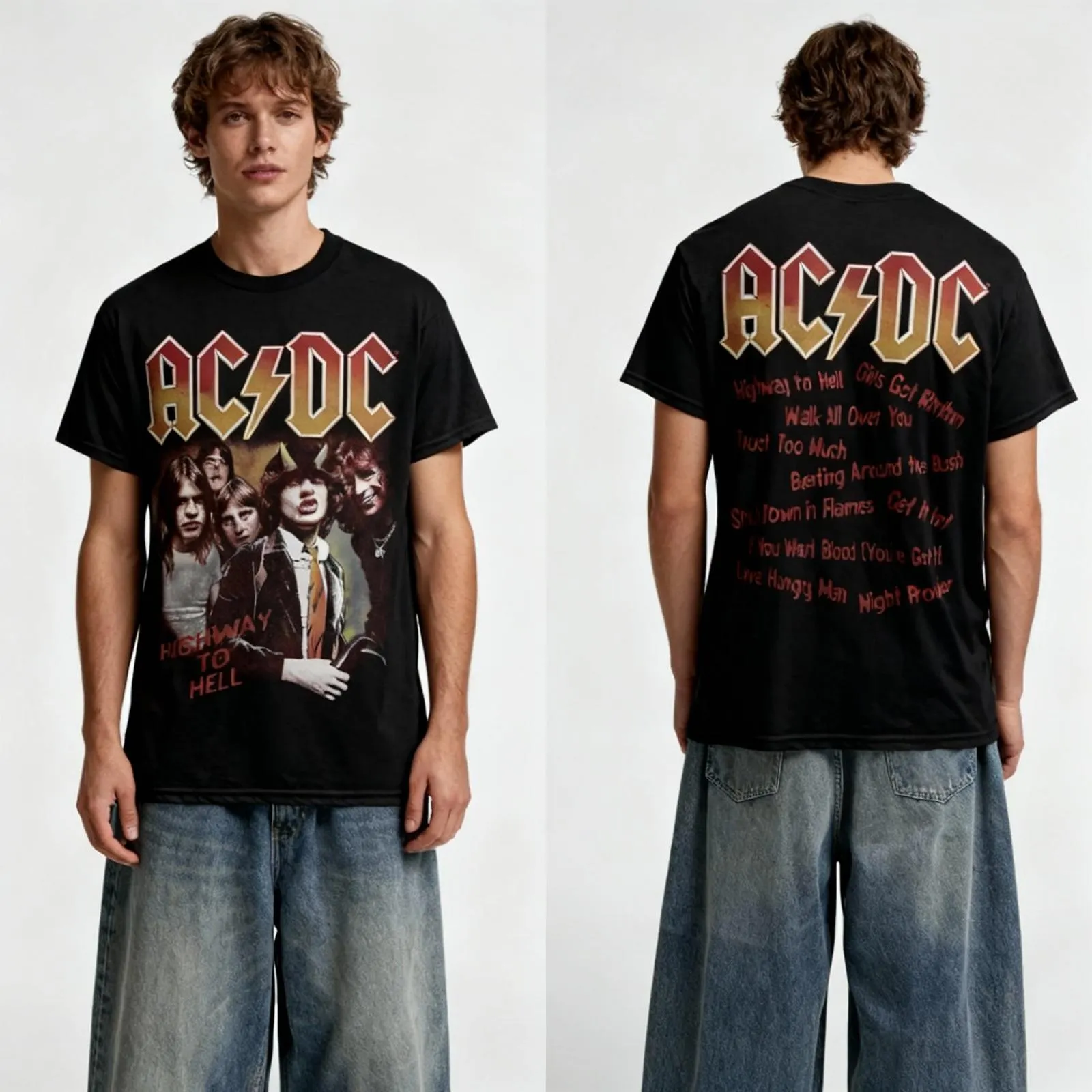 Front and back prints combine vintage rock elements, distressed textures, and bold typography that embodies AC/DC’s powerhouse style.