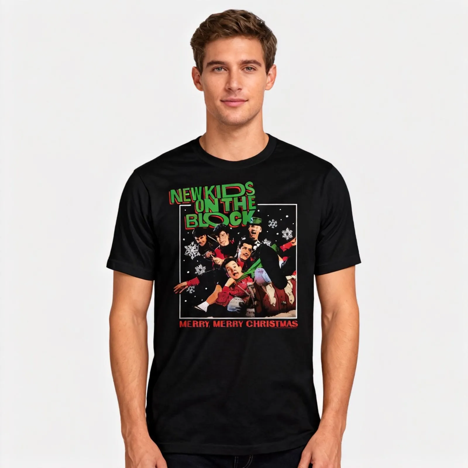 This New Kids On The Block t-shirt features the cover artwork for the band’s album Merry, Merry Christmas. This album features seasonal songs, both cover versions and original material. The track list includes “This One’s For The Children”, “The Christmas Song”, “Last Night I Saw Santa Claus”, “Funky, Funky Christmas”, “White Christmas” and “The Little Drummer Boy.” Everyone will know you are a fan of the 1989 album when you wear this Merry, Merry Christmas New Kids On The Block T-Shirt!