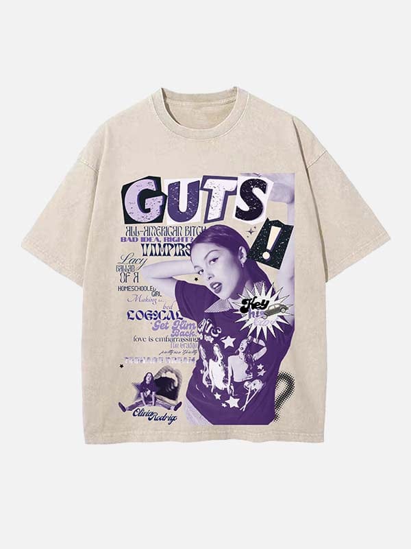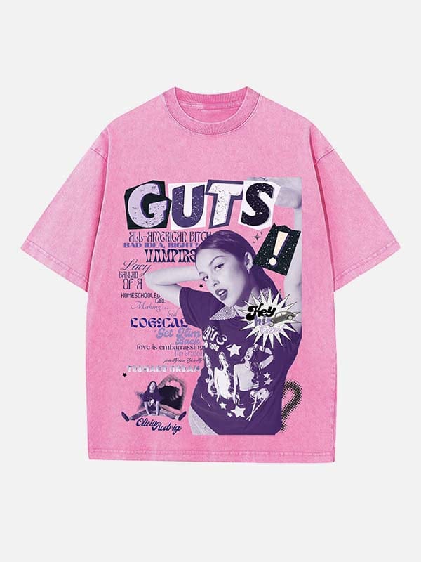Inspired by Olivia Rodrigo’s fearless pop-punk spirit, this T-shirt features a vibrant print design that captures her emotional honesty and youthful energy. Perfect for fans who love to express themselves through fashion and music.