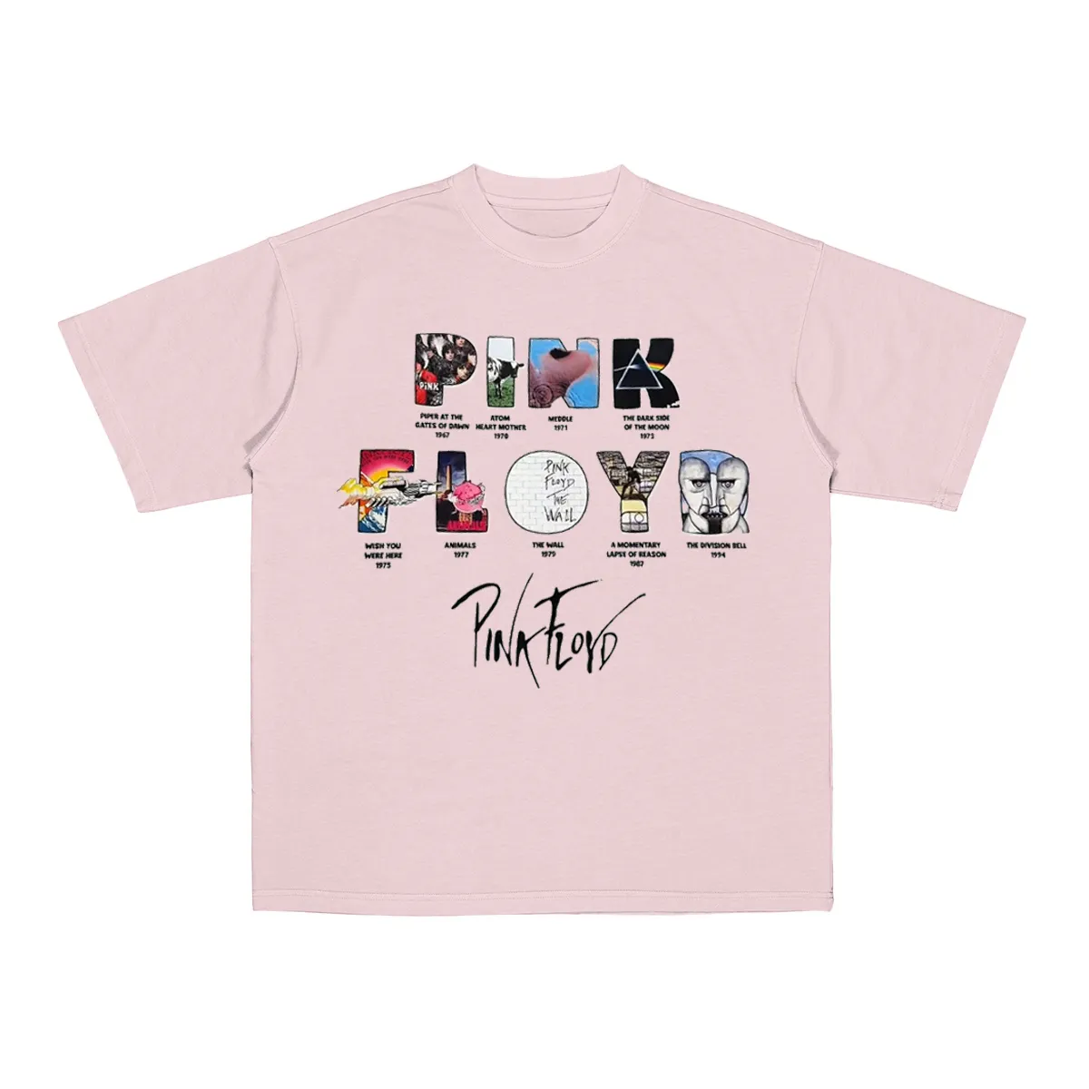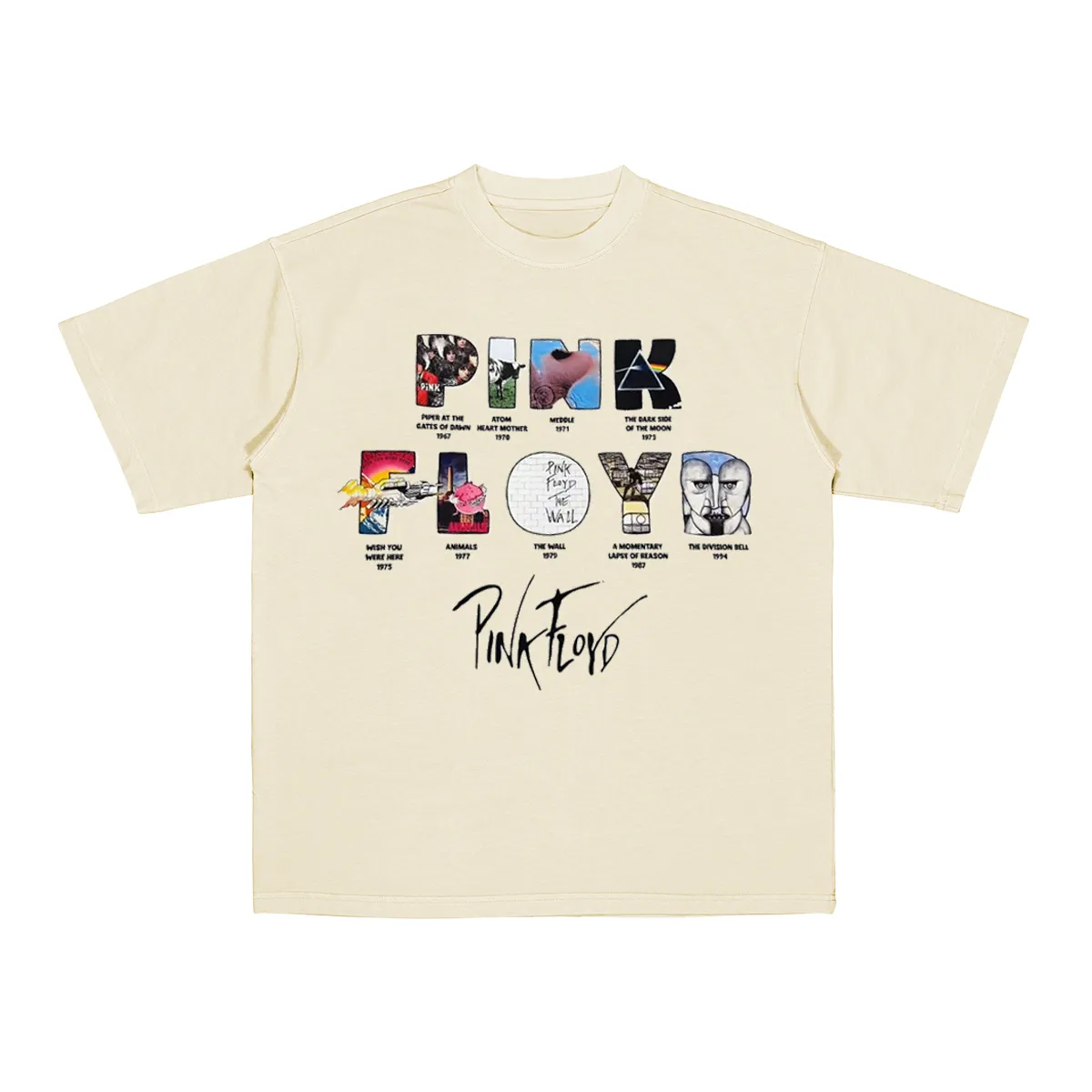 Album Journey: The T-shirt features classic album covers of the band, such as “Dark Side of the Moon” and “The Wall,” tracing their musical journey.