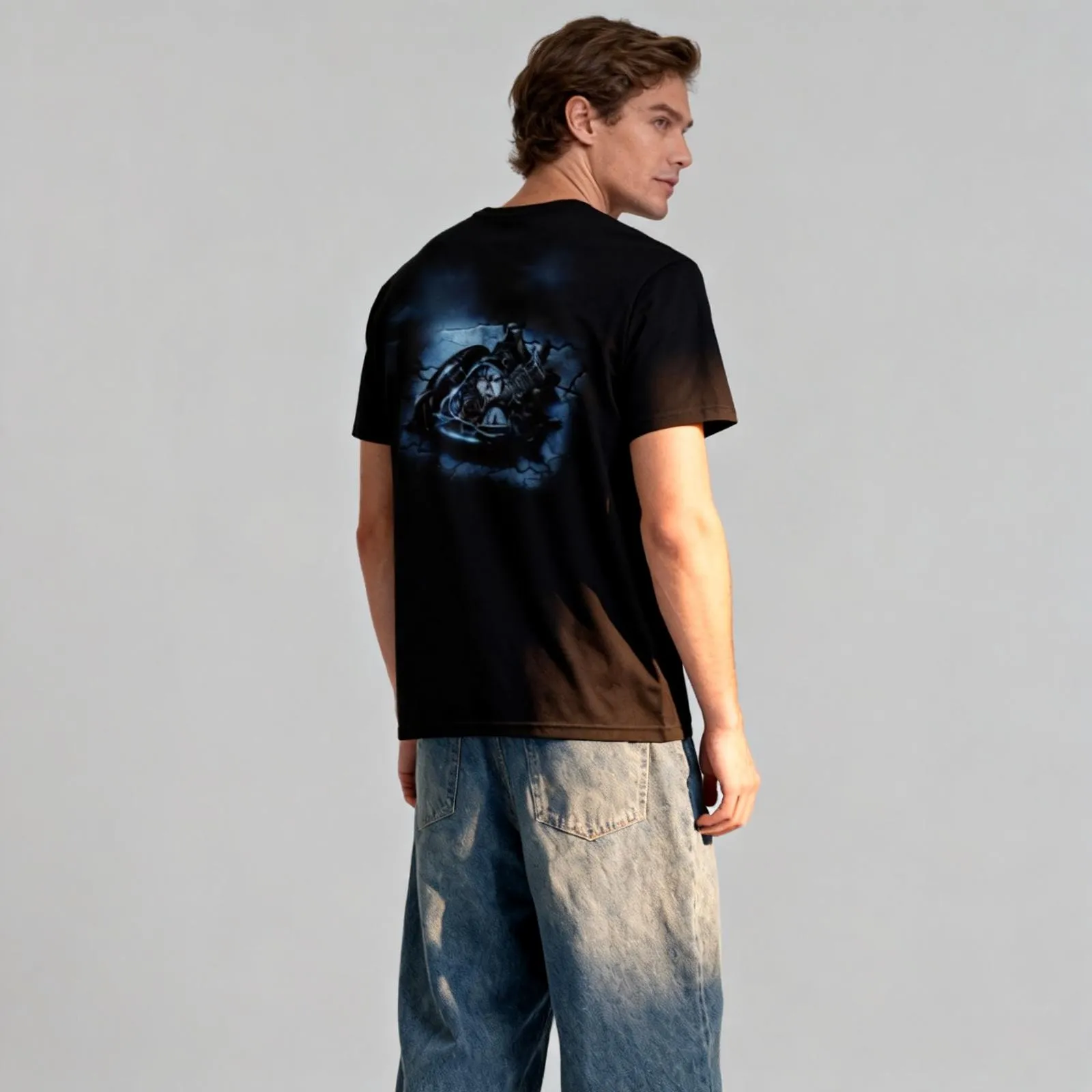 Designed with a relaxed unisex cut, perfect for all genders. The round neckline and straight silhouette offer comfort while maintaining a rugged metal-inspired look.