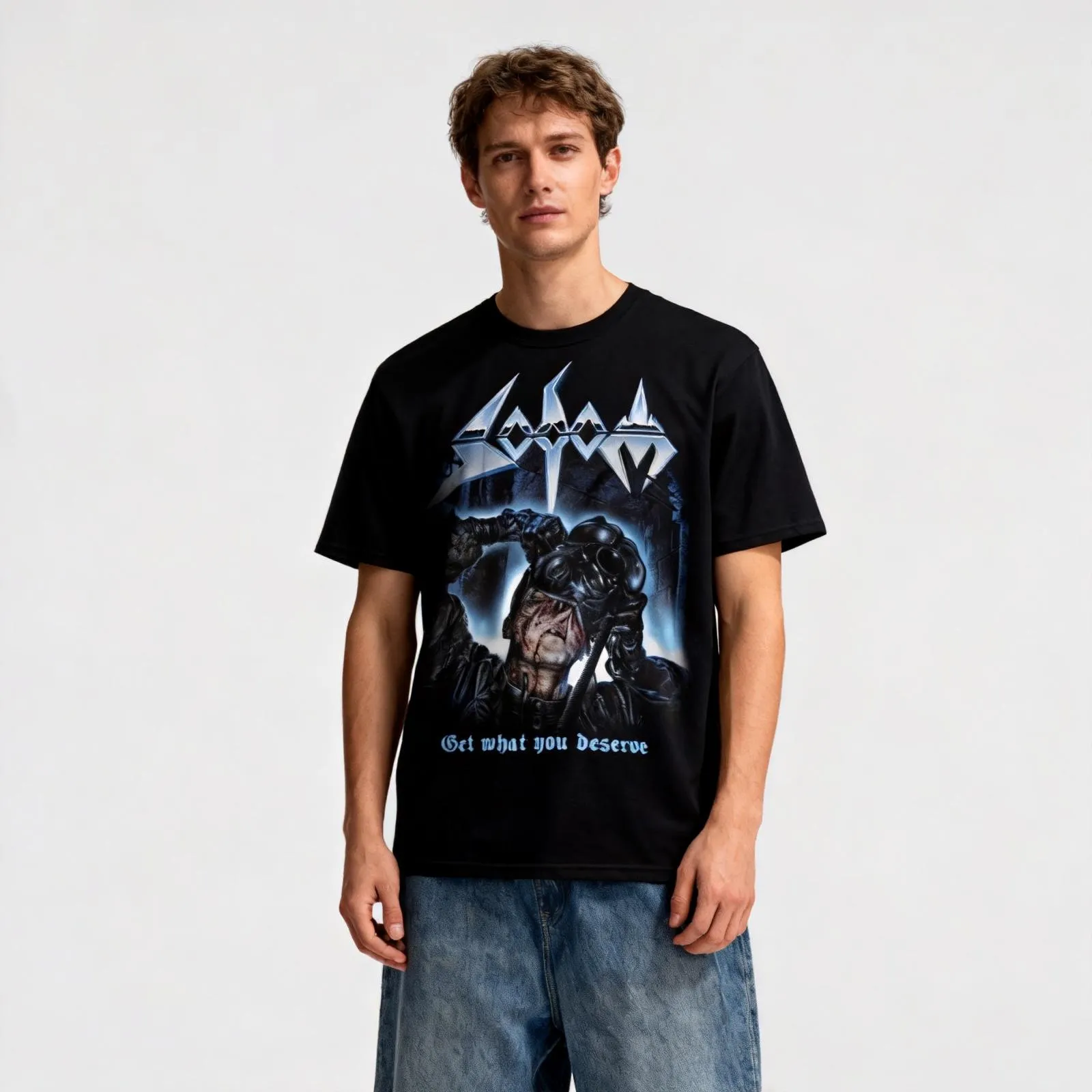 Pay tribute to legendary German thrash metal band Sodom with the “Get What You Deserve” graphic. Featuring a bold, high-contrast print, this T-shirt embodies the raw energy, aggression, and intensity of classic thrash metal.